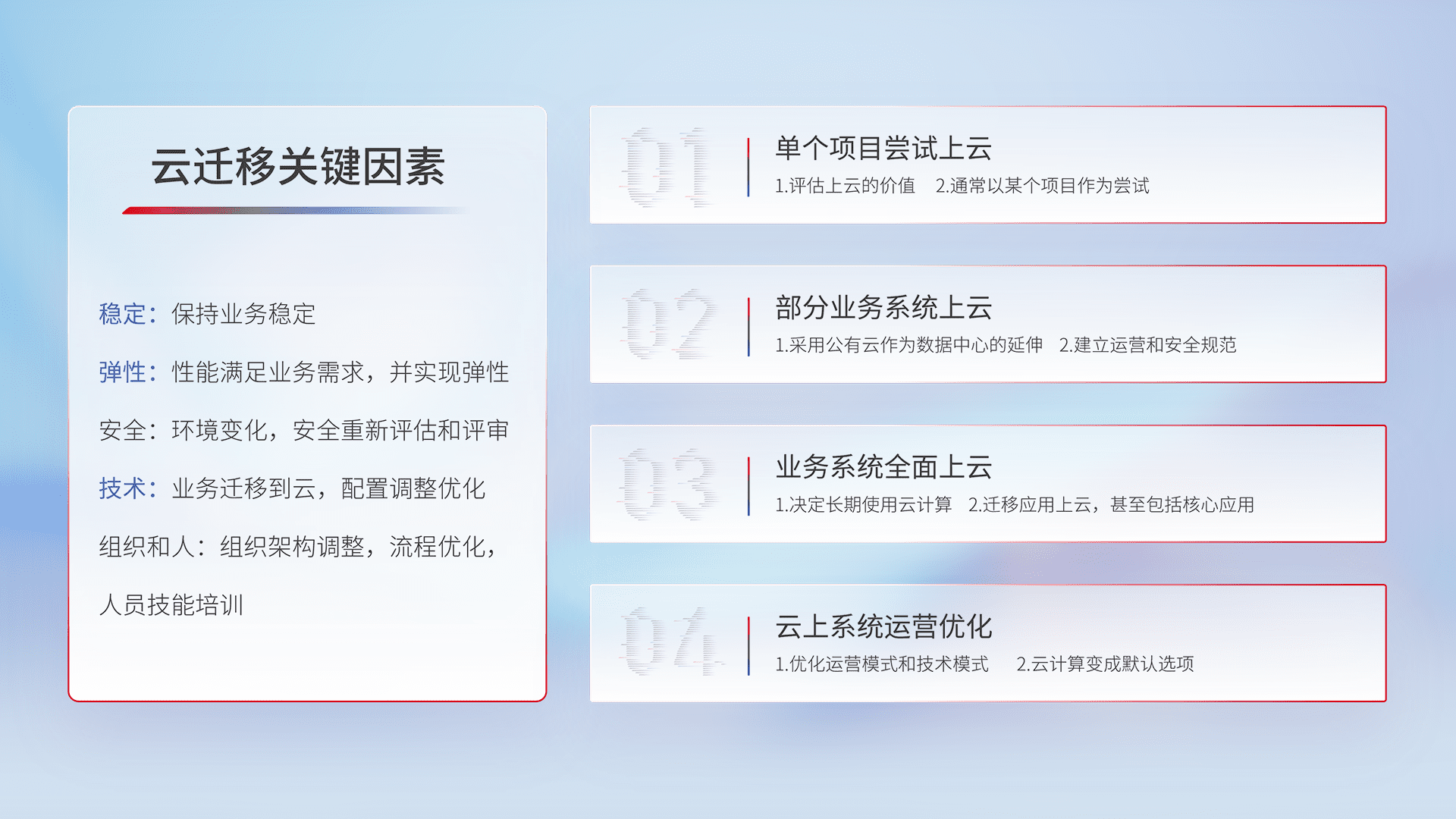 结合实际业务,,,从规划设计、、、云平台选型、、、、云原生改造、、数据迁移、、、、集成交付,,迁移全过程为客户识别最佳上云路径,,,做好风险识别管理,,,设计网络架构、、身份权限、、、安全审计合规、、、、操作审计、、、、日志审计、、、、监控告警策略、、、、多站点容灾设计等,,对云上基础设施进行整体规划,,提升IT治理水平,,以满足弹性、、、高可用、、高性能的需求。。。