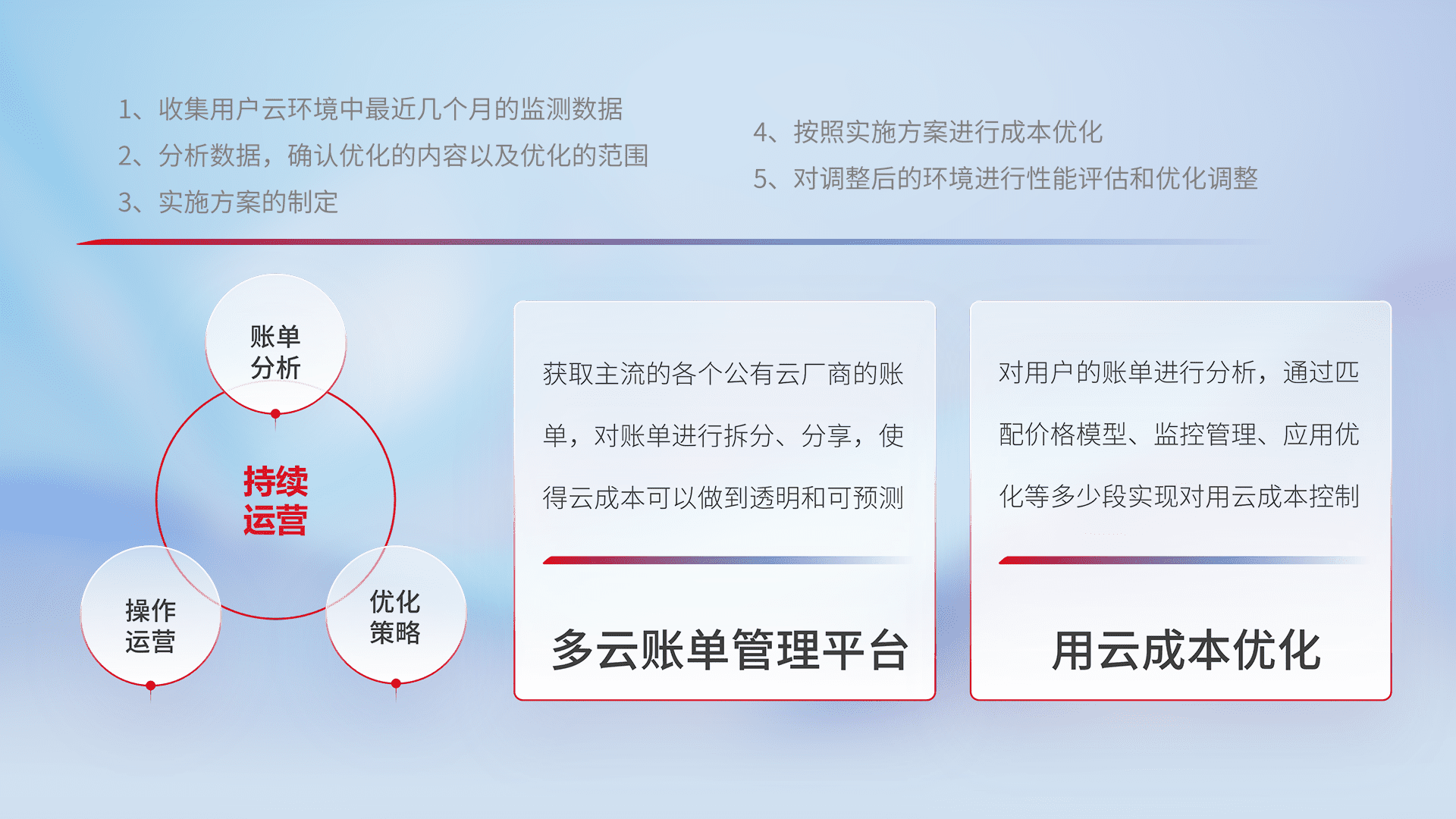 通过多云纳管,,,,以统一的资源数据模型把客户的云资源进行抽象和封装,,,,进而实现对多云资源的统一操作,,,,保障云资源管理的可靠性、、稳定性与可用性。。。。量身定制化运维内容,,配置、、、、开发运维、、、、补丁管理、、、、备份、、、、监控、、、认证和访问管理、、、、审计和日常巡检等,,保障在用云过程中的可靠度,,,,稳定度以及高可用率。。